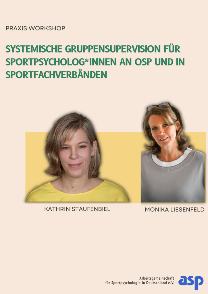 Supervision unterstützt die Entfaltung, Entwicklung und Verbesserung unseres beruflichen Handelns durch Anleitung zur Reflexion. Dies gilt sowohl für Berufseinsteiger*innen als auch für erfahrene Kolleg*innen. Im Mittelpunkt der Supervision steht der Sportpsychologe bzw. die Sportpsychologin mit seiner bzw. ihrer Berufspersönlichkeit. Das eigene Handeln, die eigene Rolle und Haltung in den unterschiedlichen Beratungsprozessen und –settings der sportpsychologischen Tätigkeiten werden anhand von aktuellen Fallbeispielen und Fragestellungen der Teilnehmer*innen reflektiert. Dabei ermöglicht das Supervisionssystem durch die Metaperspektive, die es einnimmt, einen neuen Blick auf das sportpsychologische Beratungssystem. Dieser andere Blickwinkel der Supervision ermöglicht gemeinsam mit den Teilnehmer*innen neue Ideen und Ansätze für die dargestellten Fragestellungen zu entwickeln. In diesem Workshop geben wir eine kurze Einführung in das Konzept der Supervision in Abgrenzung zu Coaching und Intervision in Anlehnung an Ebbecke-Nohlen (2025) und Schlee (2019) und stellen unseren Ansatz der systemischen Gruppensupervision für Sportpsycholog*innen vor. Um anschließend die Zeit bestmöglich zu nutzen, sollten sich die Teilnehmer*innen im Vorfeld über ein Thema oder eine Fragestellung aus der eigenen praktischen Arbeit Gedanken machen. Im Workshop entscheiden wir gemeinsam, welche Anliegen bearbeitet werden. Gerade die Zusammenarbeit von Kolleg*innen aus unterschiedlichen Settings und mit unterschiedlichen Erfahrungsstufen wird für alle gewinnbringend genutzt. Dieser Workshop geht durch die Einführung und theoretische Verortung über eine ausschließliche Supervision hinaus und bringt dieses Reflexionsformat dadurch Teilnehmenden unterschiedlichen Erfahrungsstufen näher.