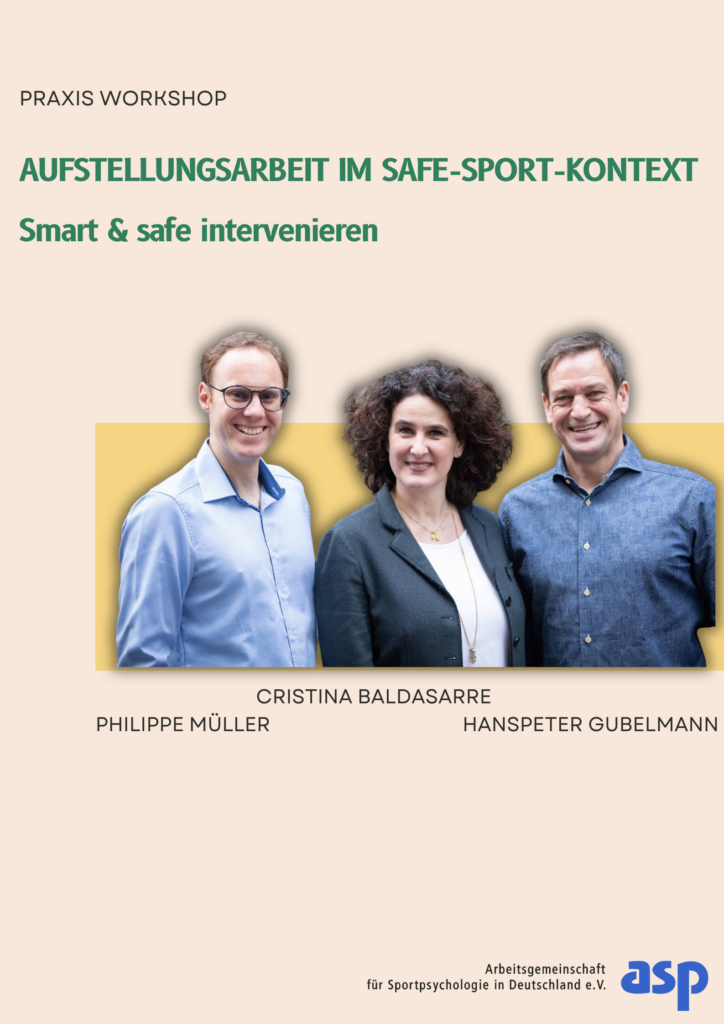 Den Schwerpunkt des Workshops bildet eine anwendungsorientierte Einführung in die Aufstellungsarbeit als „smart & safe intervention“. Nach einer kurzen theoretischen Einführung erhalten die Teilnehmenden eine strukturierte Anleitung und arbeiten im Workshop-Setting selbst mit Aufstellungen. Dabei kommen u. a. Figuren und Materialien zum Einsatz, die auch für die eigene Praxis genutzt werden können. Die Methode eignet sich insbesondere zur Klärung komplexer, belastender oder schädigender Situationen im Sport und eröffnet neue Perspektiven für Intervention, Entscheidungsfindung und Handlungssicherheit.