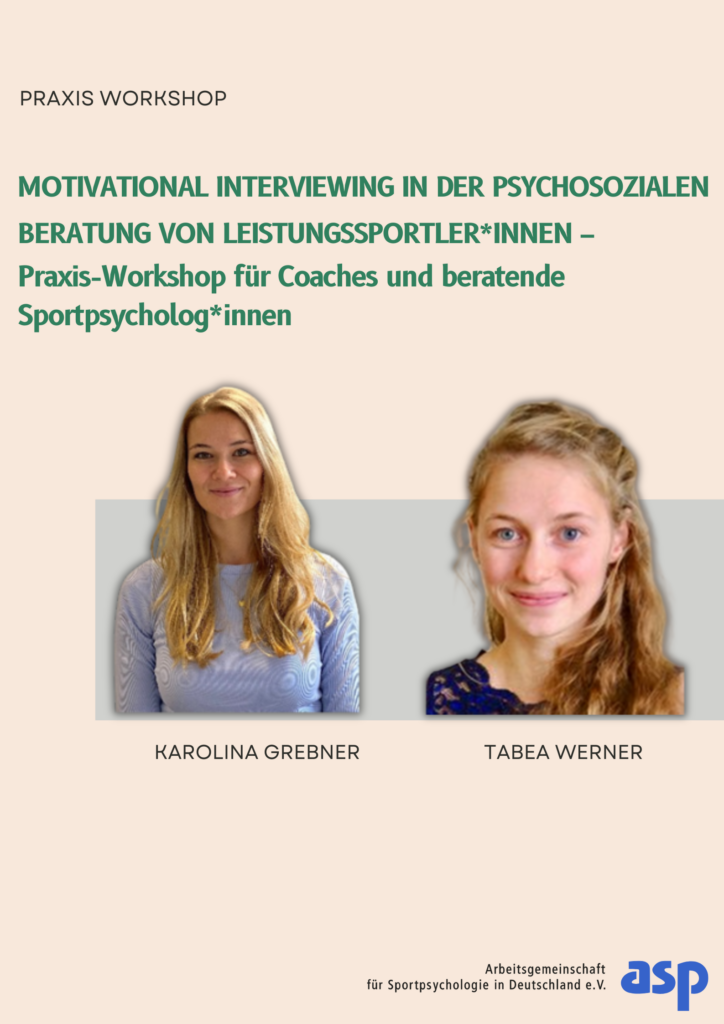 Der vorliegende 90‑Minuten‑Workshop richtet sich an Coaches und angewandt arbeitende Sportpsycholog*innen, die MI kennenlernen und gezielt einsetzen möchten, um Athlet*innen bei solchen Herausforderungen zu unterstützen. Der Workshop bietet dabei eine Einführung in MI mit praktischen Übungen und Fallbeispielen.