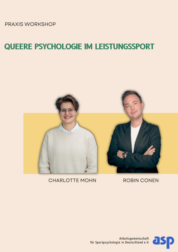 Ziel des Workshops ist es, sportpsychologisches Fachpersonal und Mentaltrainer:innen für die spezifischen Belastungsfaktoren queerer Athlet:innen zu sensibilisieren und praxisrelevante systemische Interventionsstrategien zur Unterstützung bei Diskriminierungserfahrungen im Leistungssport zu vermitteln.