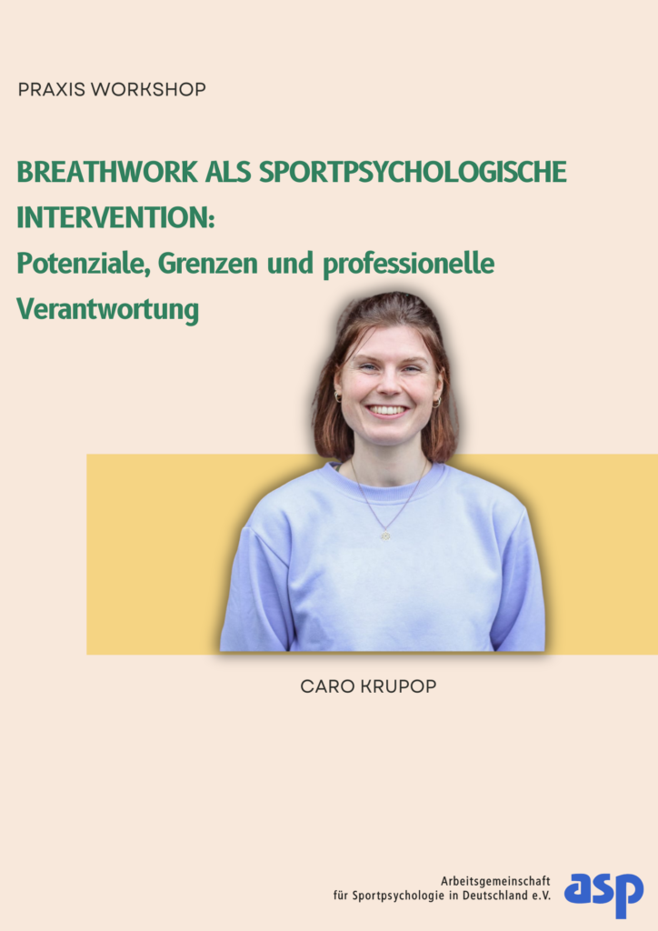 Den Schwerpunkt des Workshops bildet eine angeleitete praktische Atemsession, ergänzt durch eine theoretische Einordnung zentraler psychophysiologischer Mechanismen sowie von Gestaltungskriterien wirksamer Atempraxis. Die Teilnehmenden erproben grundlegende Atemtechniken und reflektieren deren Wirkungen im eigenen Erleben. In einer anschließenden Gruppenreflexion werden Anwendungsmöglichkeiten und Potenziale im sportpsychologischen Kontext, Grenzen der Interventionen sowie relevante Kontraindikationen diskutiert. Ergänzend erfolgt eine kritische Einordnung von Atempraktiken mit Ursprüngen in bewusstseinsverändernden bzw. psychedelisch geprägten Ansätzen im Hinblick auf emotionale Offenheit, Verbundenheit und professionelle Verantwortung in der Arbeit mit Athlet:innen.